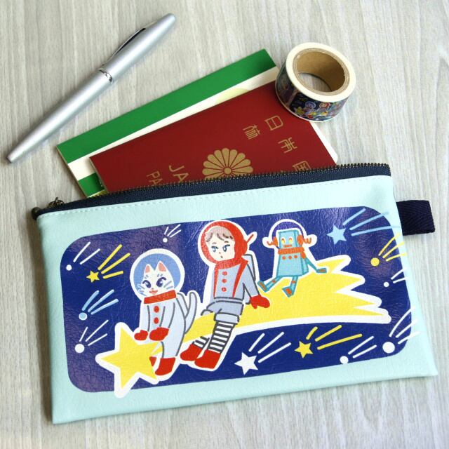 合皮フラットポーチ - 白猫マイカの宇宙旅行 ミント